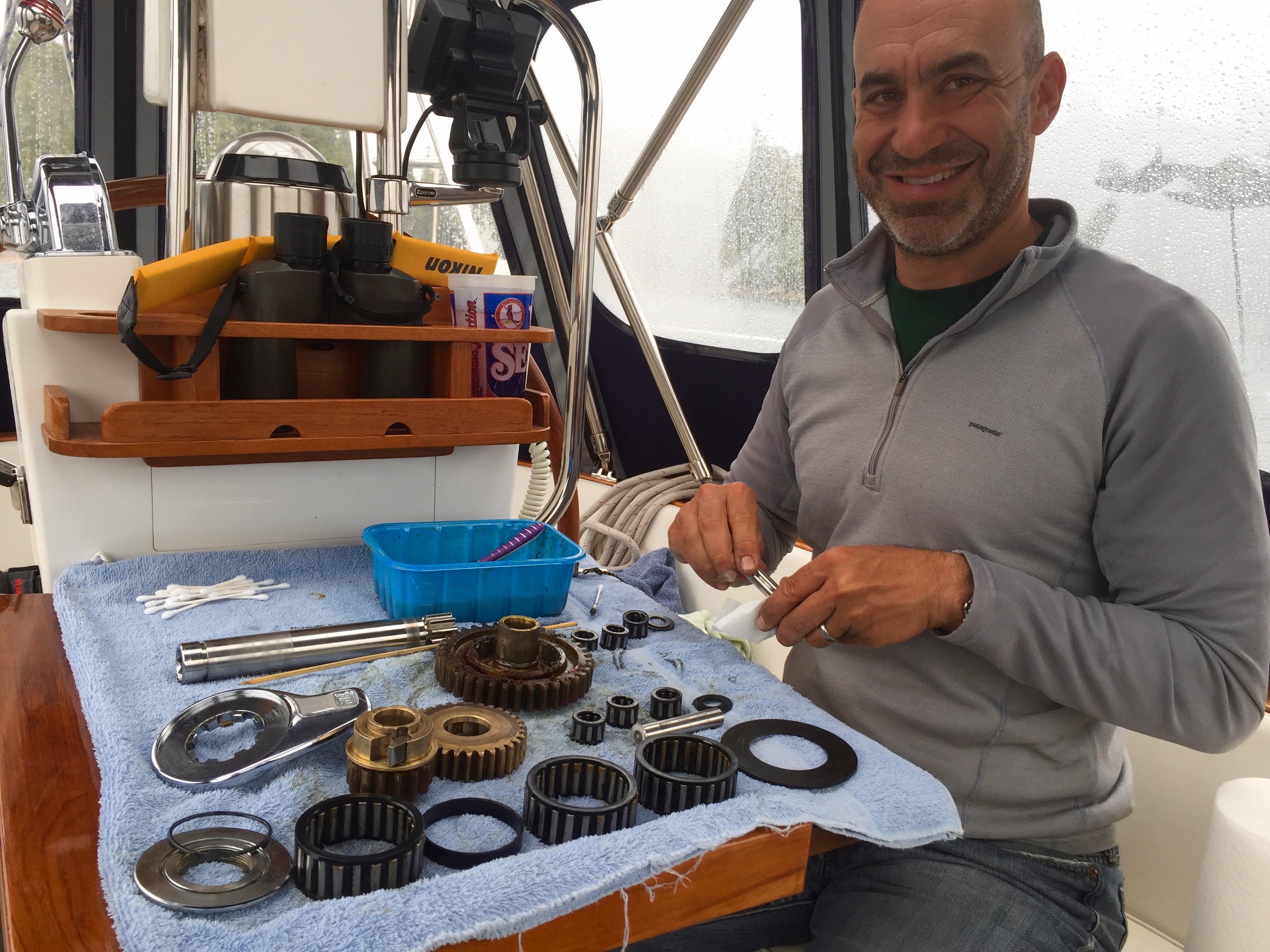 All that rain was a good chance for indoor projects, and we took the opportunity to service the winches that control Madrone’s sails and lines.
