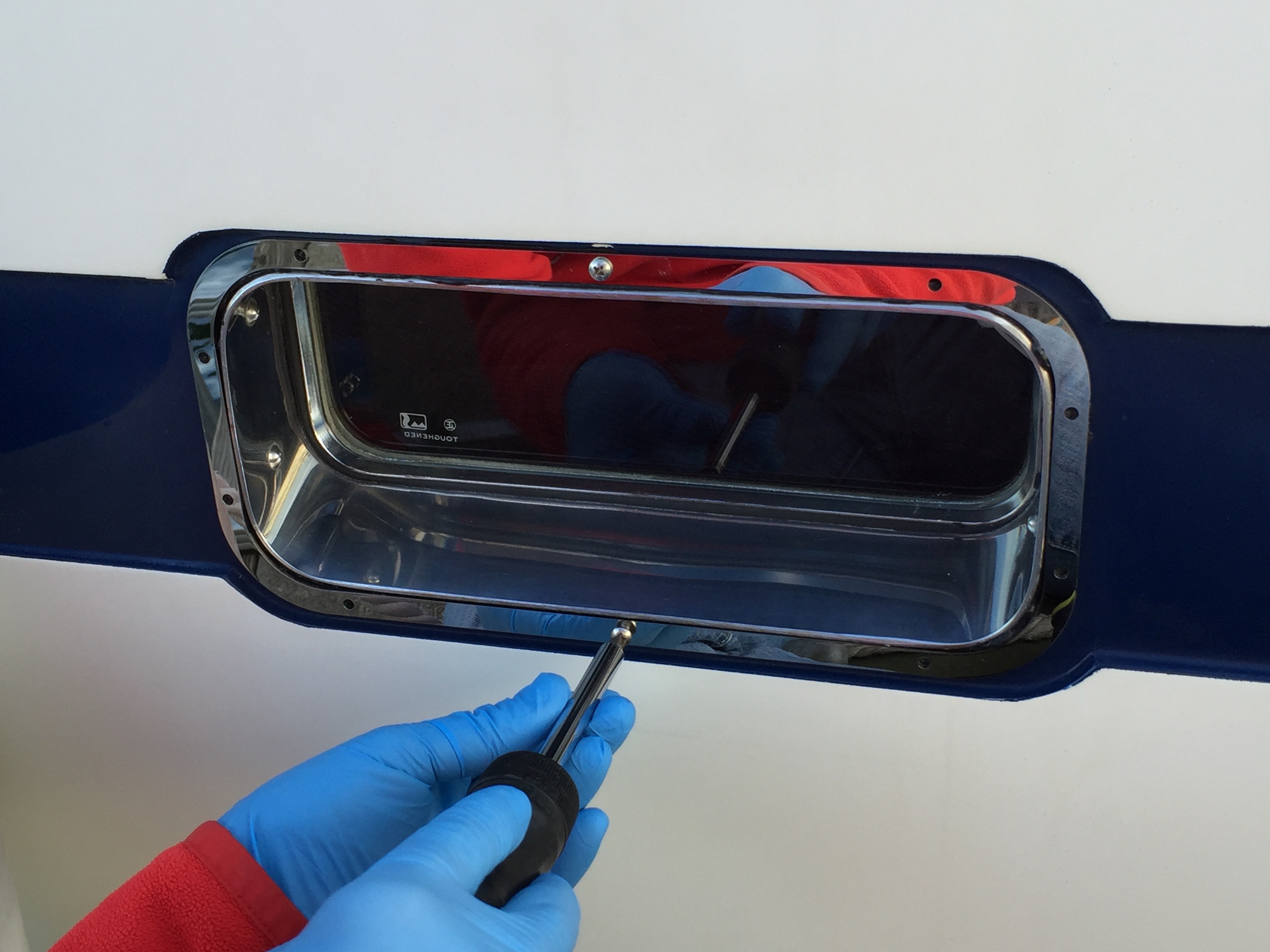 The first step was to grind a trench (about 1/4” deep x 1/2” wide) around each of the ports using our handy Dremel tool. Next came drilling mounting holes for the trim pieces and then countersinking each one to form a recess for the sealant. Then we cleaned, and cleaned, and cleaned to prepare for the placement of the sealant and trim.