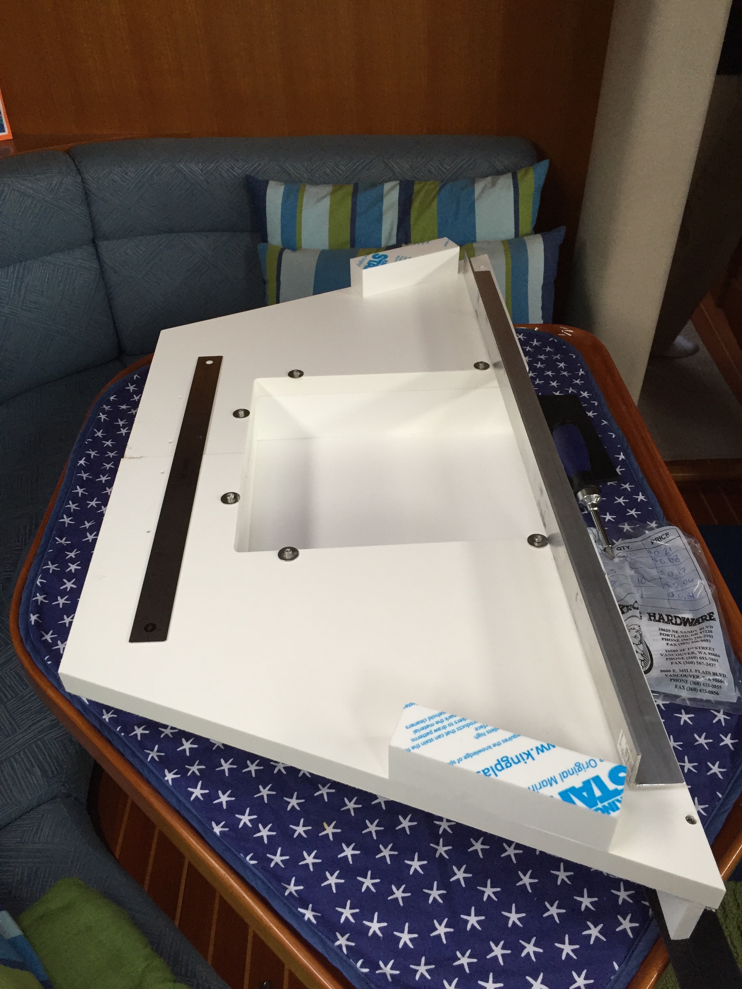 Aft of shelf we designed a Sunbrella panel which snaps into place to prevent the chain from sliding off the back of the shelf and into the bow thruster area. Angie sewed the custom panel and installed snap fittings to hold it securely in place.