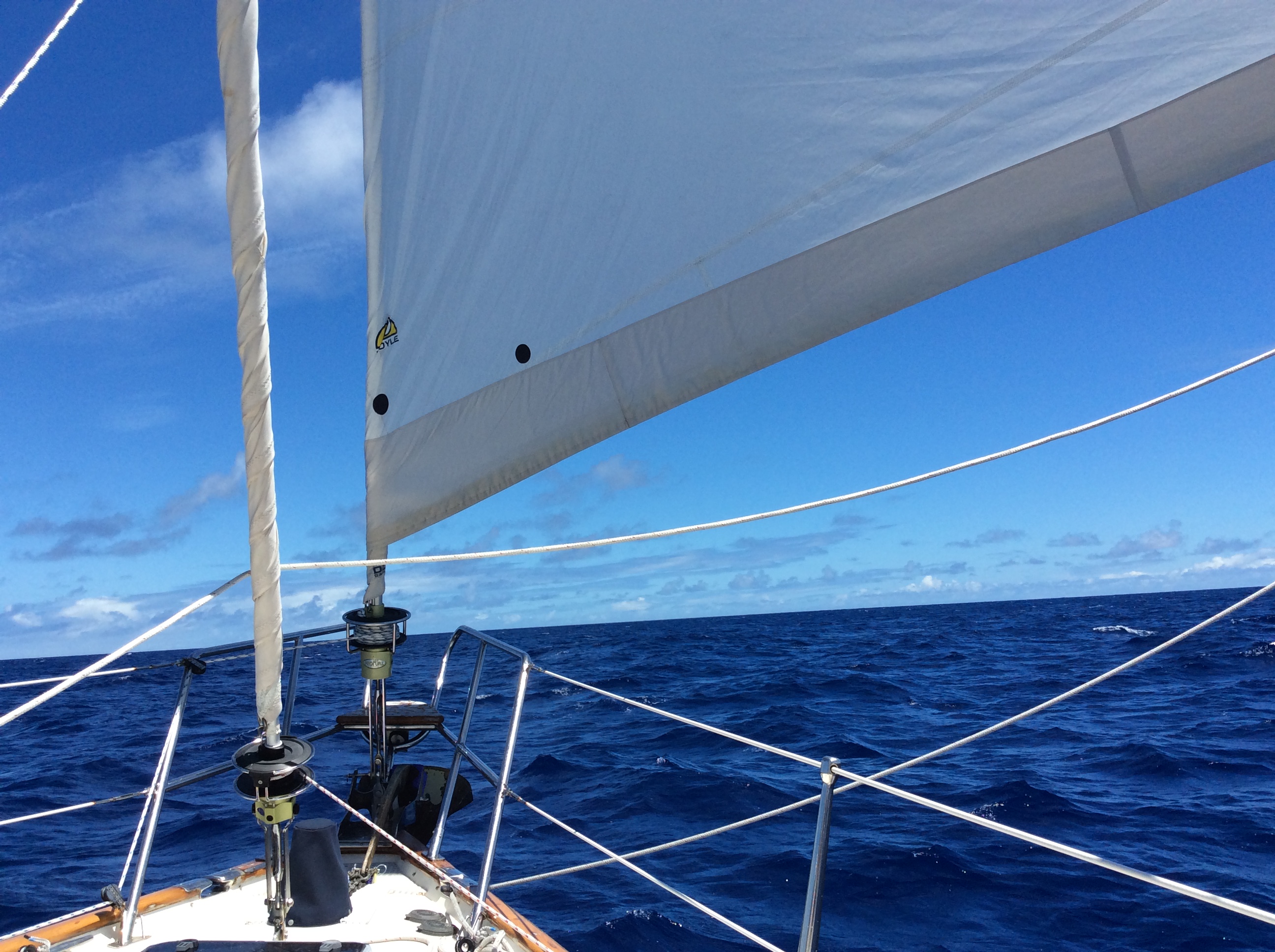 The wind became light after 4am, and actually dropped to zero for a few minutes. When it returned, it was a comfortable 12-15 kts from a steady direction. Today, the challenges of last night seem far away – we have bright sunny skies, and Madrone is easing along at 4-5kts in 8-9 kts of breeze. Seas are only 2-4′, and the water sparkles blue in the sun.